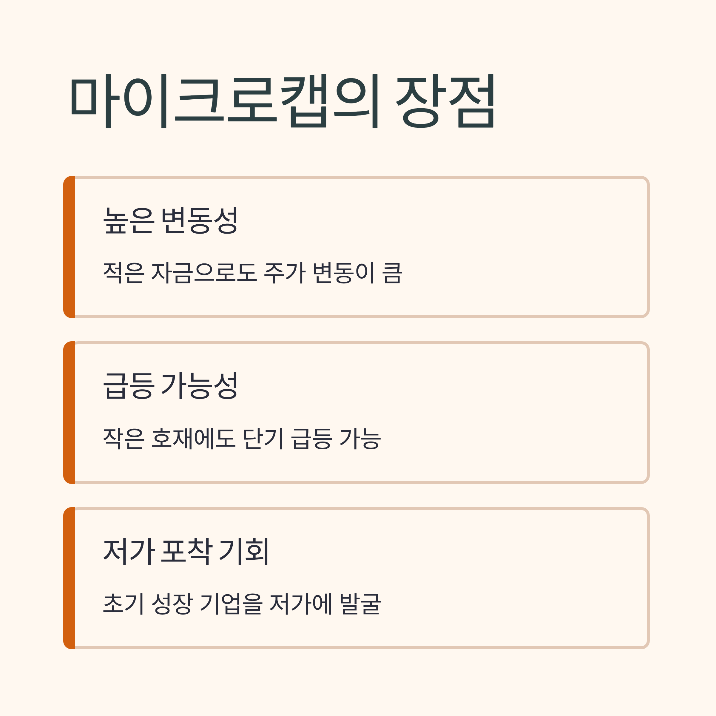 - 마이크로캡(Micro-cap): 시가총액 1천억 원 이하