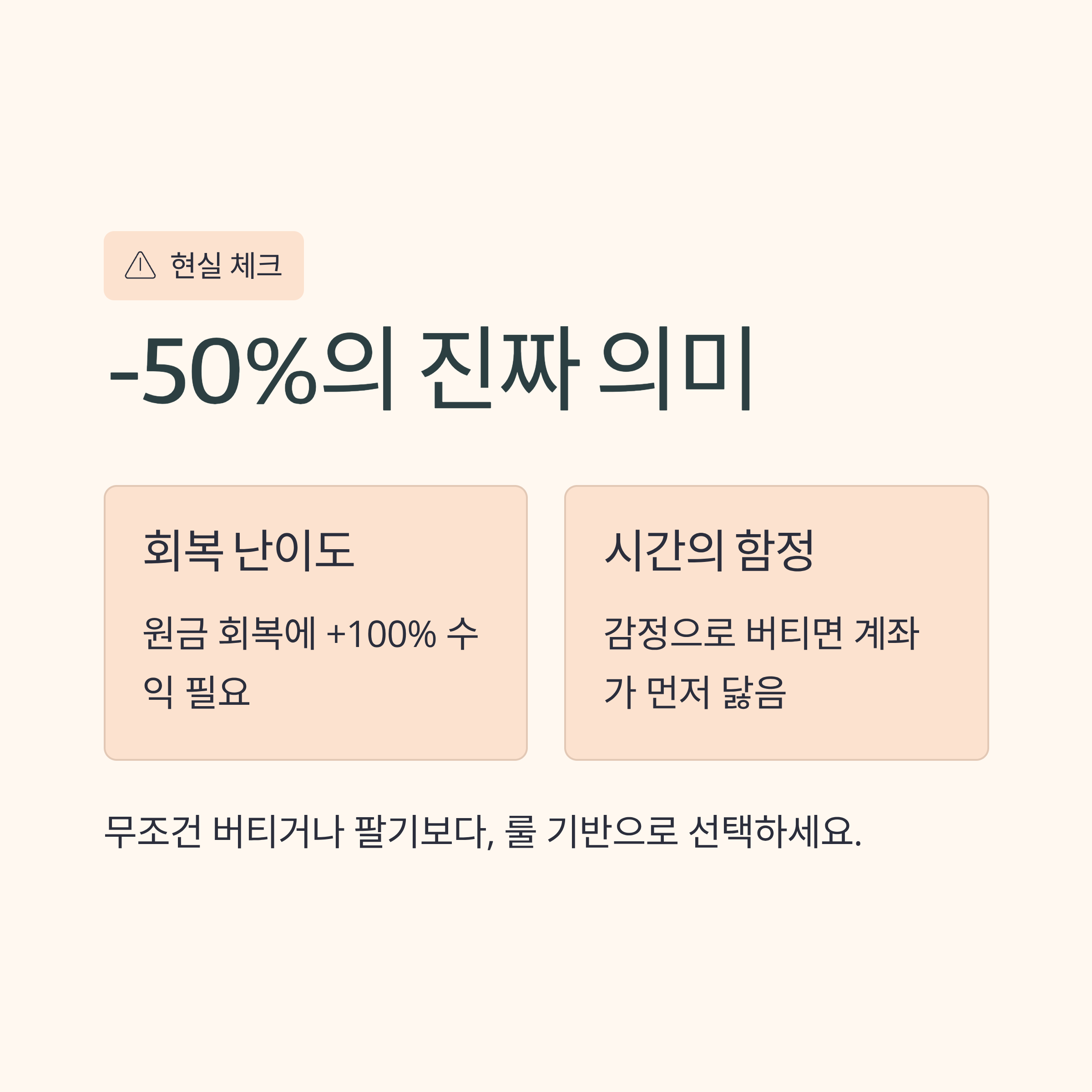 -50%는 단순히 “많이 빠졌다”가 아니라, 원금 회복에 +100%이 필요한 구간입니다.