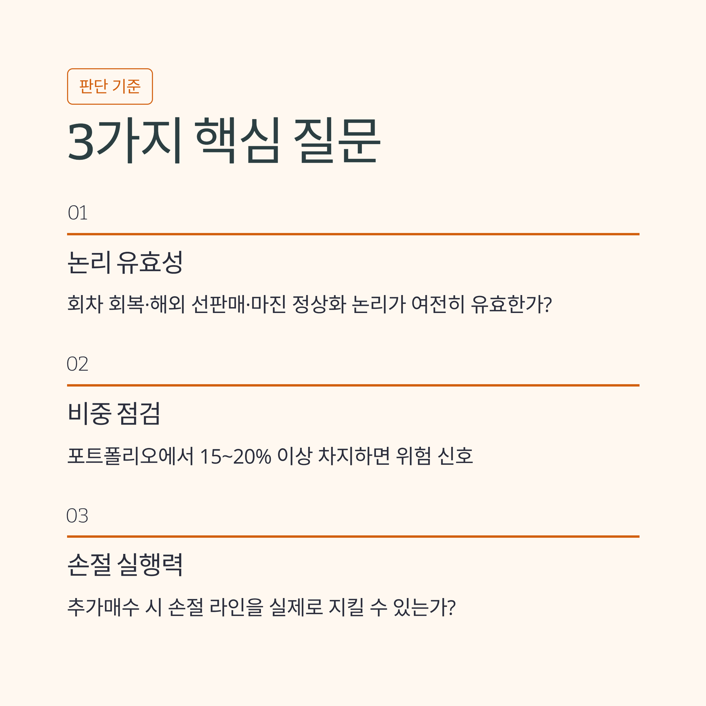 논리가 흔들리거나, 비중이 과하거나, 더 버티면 멘탈/현금흐름이 깨질 때.