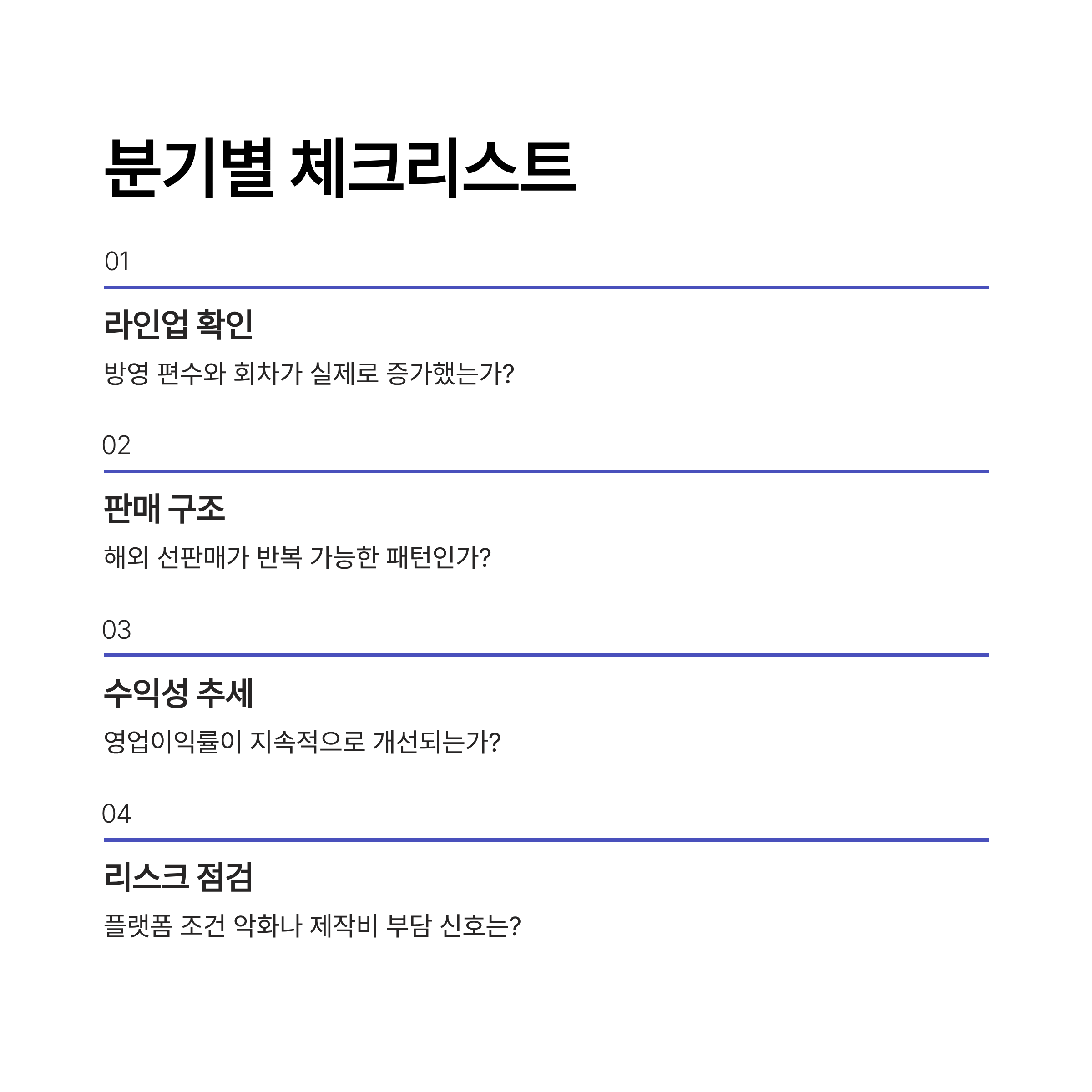 - 판단 기준: 회사가 말하는 “라인업 회복”이 실제로 분기별 방영 편수/회차로 확인되는지