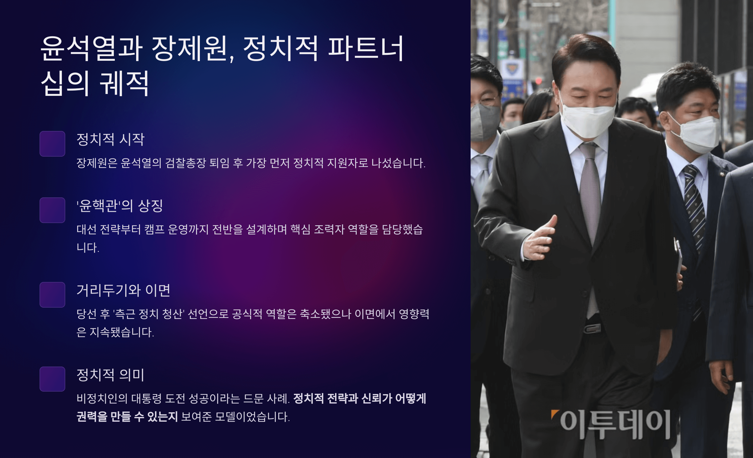 윤석열과 장제원의 관계는 비정치인의 대통령 도전을 성공시킨 보기 드문 사례로, 정치적 전략과 신뢰가 어떻게 권력을 만들 수 있는지 보여준 대표적 모델이었습니다.