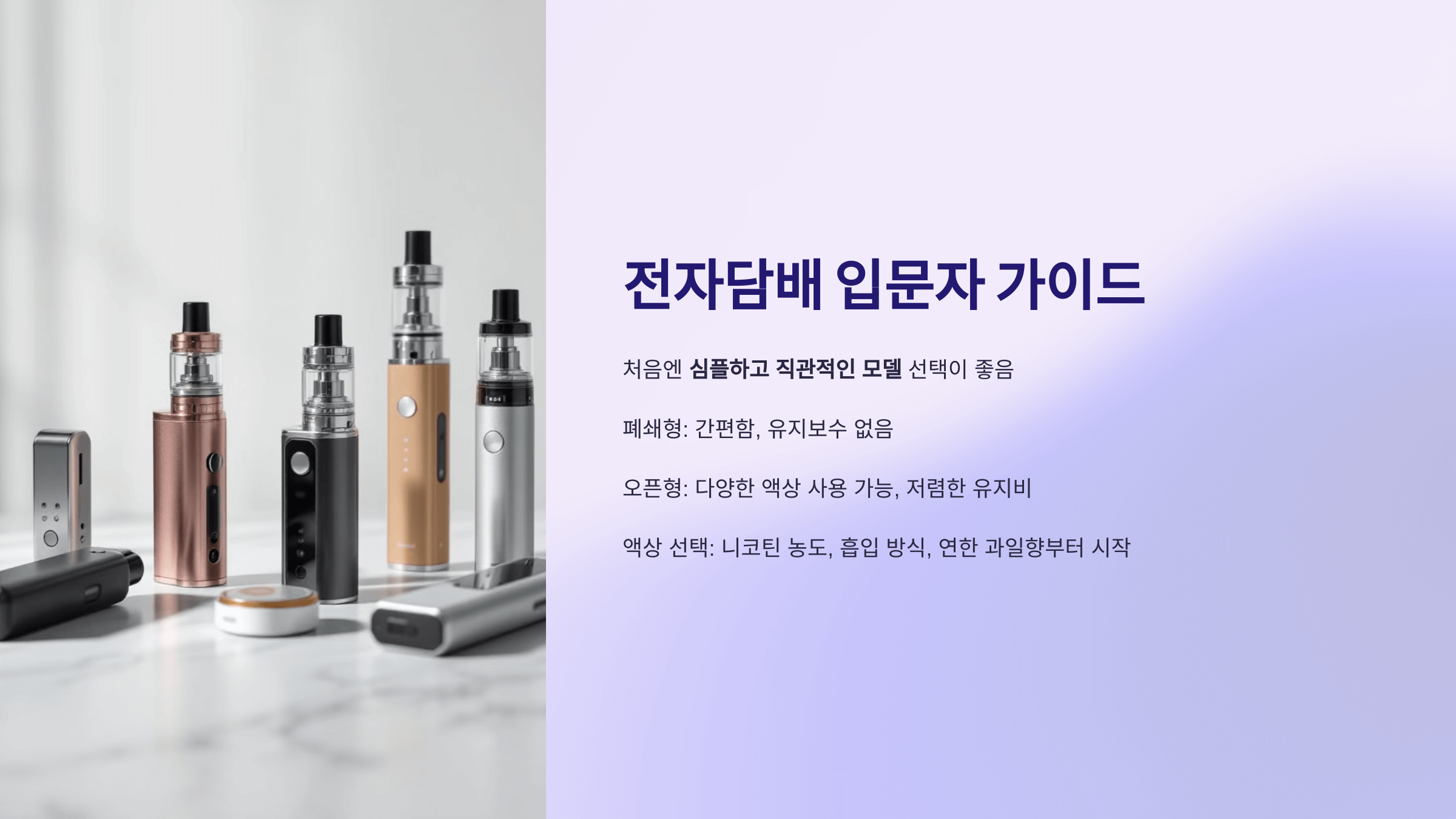 전자담배에 처음 입문하는 분들이 가장 먼저 느끼는 건 어디서부터 시작해야 할지 모르겠다는 막막함입니다. 기기도 종류가 너무 많고, 액상은 이름도 생소하며, 금연까지 이어질 수 있을지도 의문이 들죠. 이 글에서는 전자담배 초보자들을 위한 실질적인 가이드를 제공합니다. 입문자용 기기 추천부터 액상 선택법, 그리고 금연을 도울 수 있는 실용적인 팁까지 모두 담았습니다.